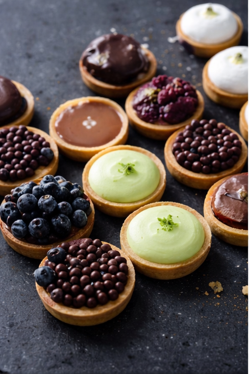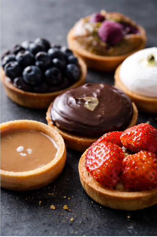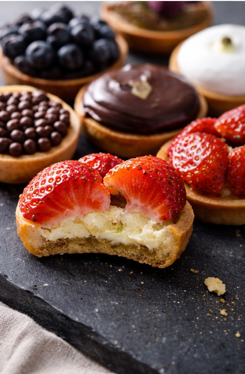 Een verfijnde collectie handgemaakte mini-tartelettes met verrassende vullingen en toppings. Van frisse fruitcreaties met framboos, aardbei en bosbes tot elegante smaken zoals matcha, karamel, citroen, chocolade en noten. Perfect voor een high tea, een dessertbuffet of als een luxe traktatie bij de koffie. Elke tartelette is een klein kunstwerk dat smaak en elegantie combineert.