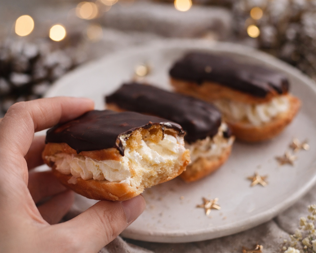 Heerlijke luchtige éclairs gevuld met romige crème en afgewerkt met een rijke chocoladelaag. Perfect voor een luxe genietmoment.
